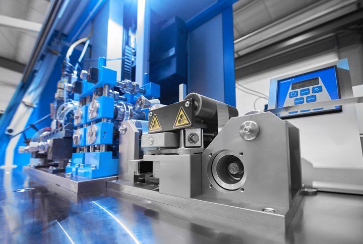 To ensure precise molding, we place guiding controls in front of the forming tools. A sensor observes where the strip is at all times and controls it precisely to the center of the formation via two movable rollers. As a result, the aluminum strip is always held in an ideal position for the welding process without the intervention of an operator. With this unique technology, there is no need to use the usual lateral guide rollers. Damage to the belt edges is a thing of the past. An Ethernet connection enables the customer to display the belt position on an external workstation at any time.